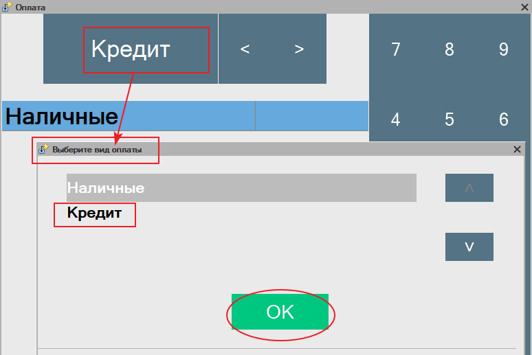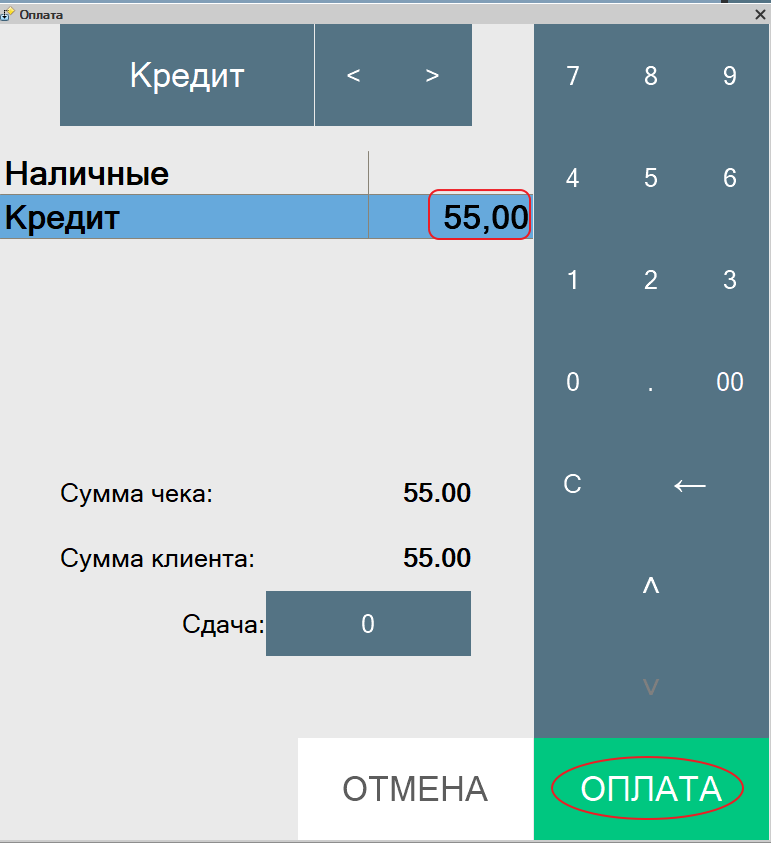 Открывается форма «Выберите вид оплаты». Следует выбрать вид оплаты «Кредит» и затем нажать кнопку «ОК». В форме «Оплата» в строке «Кредит» следует ввести число, указанное в реквизите «Сумму чека», и потом нажать кнопку «ОПЛАТА».
