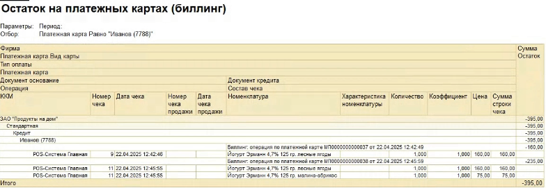 При необходимости кассир может сформировать на кассе онлайн отчет «Биллинг платежных карт: Остаток по карте» (подробнее см. «Справочник «Отчеты для удаленного открытия»»), в котором показываются чеки и товары, закупленные по кредитной карте ранее.