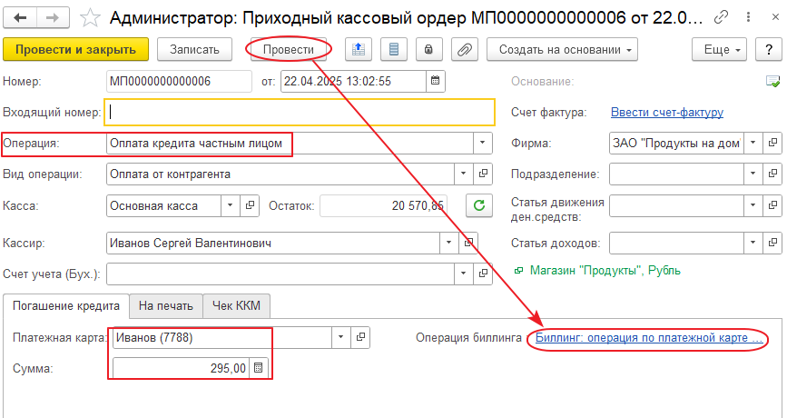 После проведения документа в поле «Операция биллинга» табличной части «Погашение кредита» будет указана ссылка на сформированный документ «Биллинг: операция по платежной карте». Если исходный документ «Приходно-кассовый ордер» будет удален, то в документ «Биллинг: операция по платежной карте» будет добавлена строка с отменой операции внесения денег.