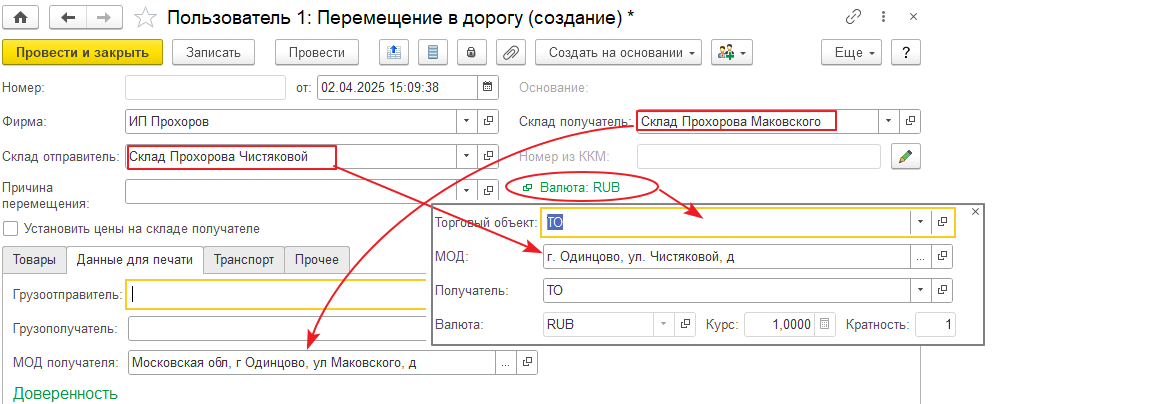 В документе «Перемещение в дорогу» заполняются реквизиты «Фирма», «Склад отправитель» и «Склад получатель». По связи со складами определяются «МОД получателя» (закладка «Данные для печати») и «МОД» отправителя (форма, которая открывается по ссылке «Валюта»)