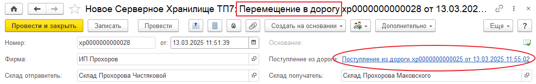 Дале в ТП7 открываем исходный документ «Перемещение в дорогу» и по ссылке в реквизите «Поступление из дороги» переходим в документ приемки «Поступление из дороги».
