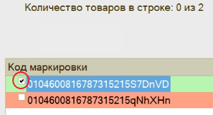 На закладке «Коды маркировки» открытого документа указаны коды маркировки из документа «Перемещение в дорогу», оформленным при отгрузке в ТП7 — они выводятся на красном фоне. После сканирования реально поступивших кодов маркировки, у строки с этим кодом фон изменяется на зеленый и у КМ проставляется «галочка». Если код маркировки не совпал с КМ из документа, он записывается в табличную часть закладки «Проблемные товары».