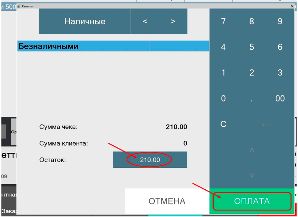 - В окне оплаты по умолчанию способ оплаты - Безналичными,