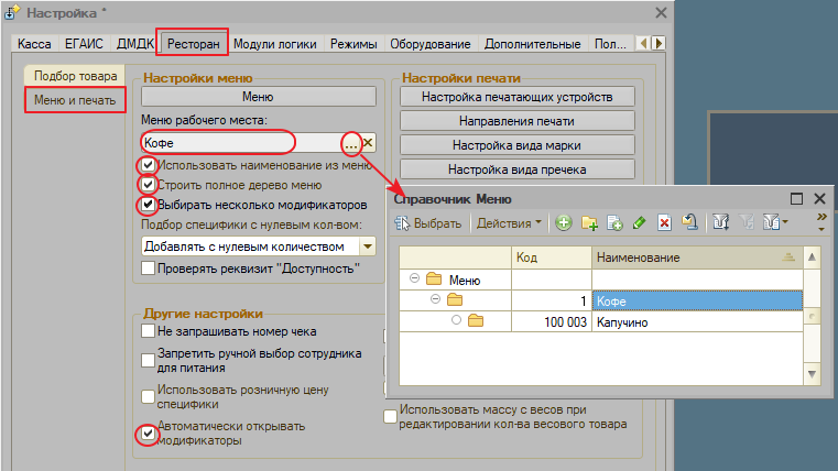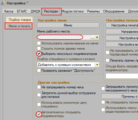 На закладке «Ресторан» настроек кассира следует на странице «Меню и печать» в поле «Меню рабочего места» следует выбрать нужное меню и установить флаг «Автоматически открывать модификаторы». Если установить флаг «Выбирать несколько модификаторов», то при продаже основного товара открывается окно с модификаторами и можно выбрать несколько. Если флаг не установлен, то открывается окно и после выбора модификатора окно сразу закрывается, т.е. подбирается один модификатор. Так же могут быть заданы флаги: «Использовать наименование из меню» и «Строить полное дерево меню».