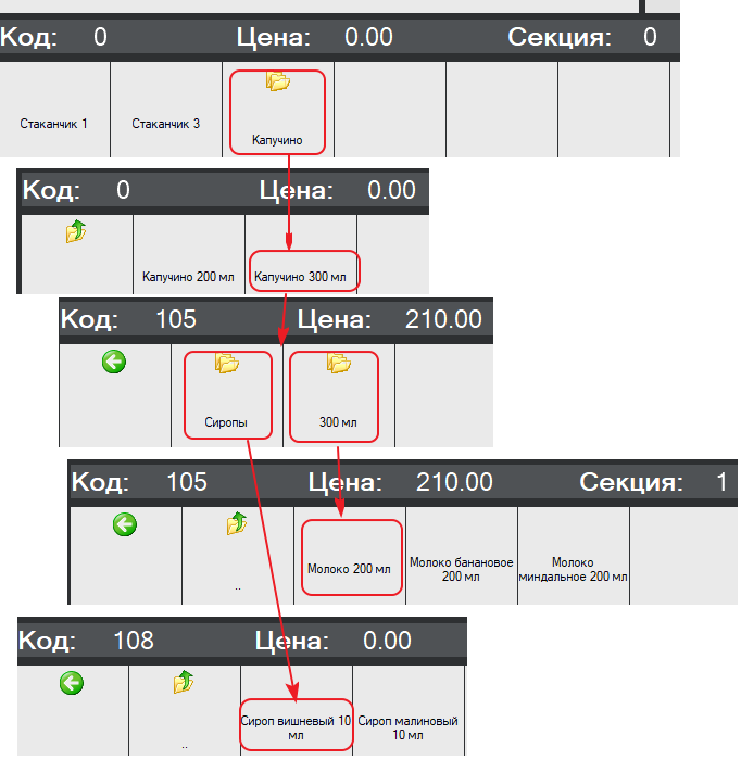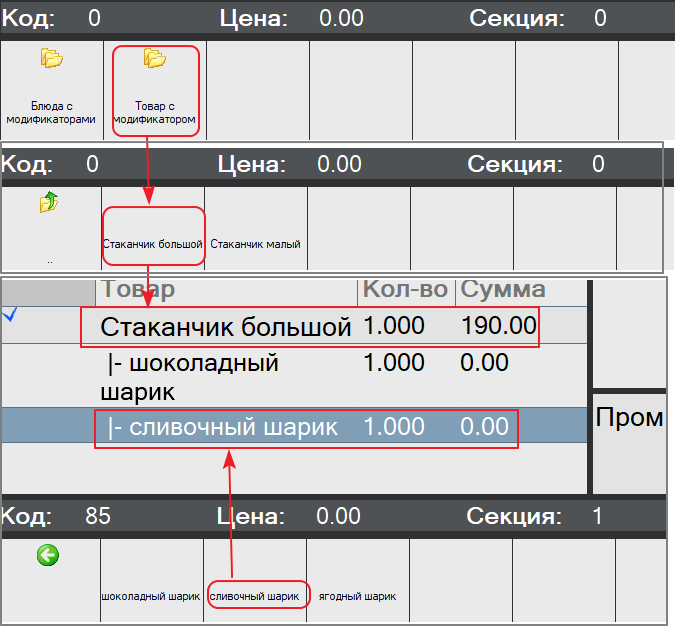 На кассе, следует открыть нужное меню, выбрать товар и подобрать модификаторы к блюду.