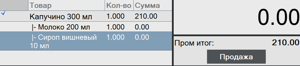 При продаже основного товара на кассе, следует открыть нужную группу товаров и выбрать товар. На экран выводится список модификаторов, которые можно добавить к товару. При выборе нужного модификатора он добавляется в чек продажи: