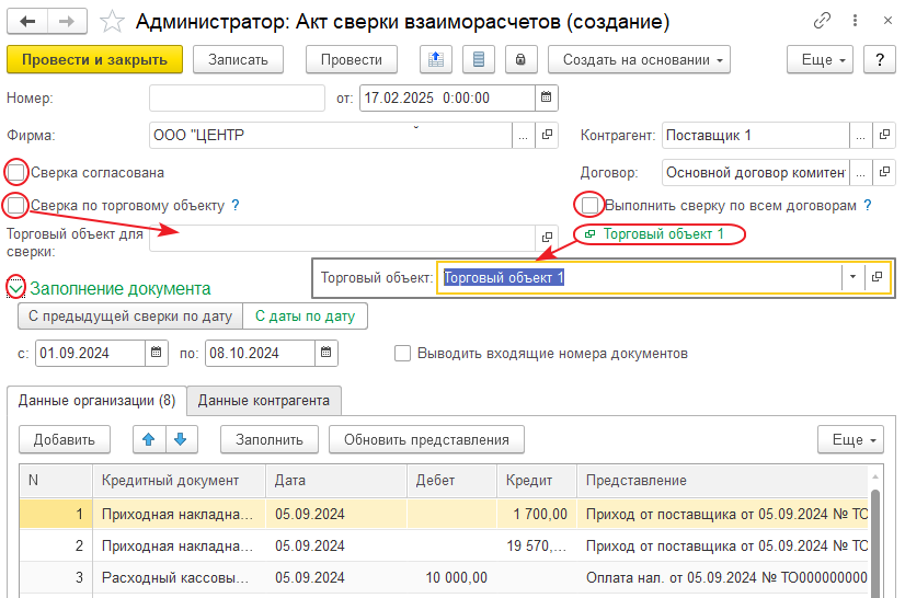 При установленном флаге в сверку попадут только документы по указанному торговому объекту. Торговый объект самого документа акта сверки при этом игнорируется.