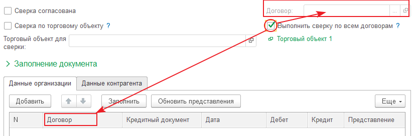 Если при сверке по всем договорам также включен флаг «Сверка по торговому объекту», логика заполнения кредитного документа не изменяется: выполняется отбор кредитных документов по контрагенту и торговому объекту, колонка «Договоры» заполняется договорами из этого документа кредита.