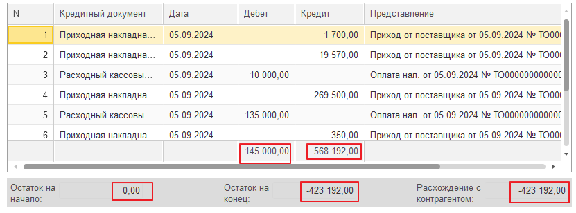 - «Остаток на конец» — отображает остаток по взаиморасчетам с организацией по контрагенту документа на конец дня периода заполнения сверки;