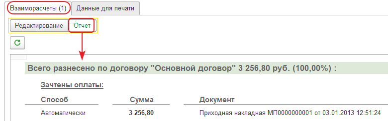 - существует возможность переключиться с табличной части на отображение отчета аналогичный отчету, описанному в варианте автоматического зачета предоплат.