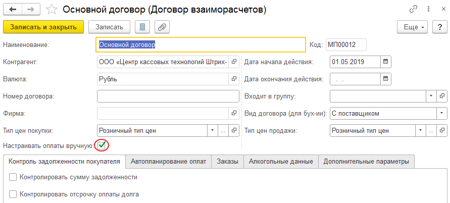 Если флаг «Настраивать оплаты вручную» в договоре взаиморасчетов задан, то в документах, ссылающихся на данный договор, для способа взаиморасчетов с контрагентом устанавливается по умолчанию значение «Вручную».