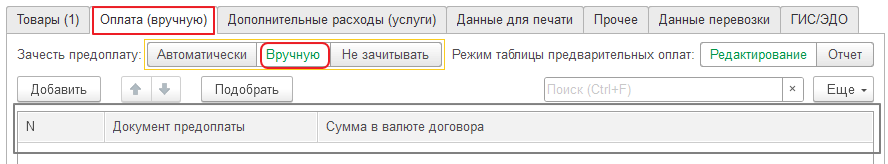 На данную закладку выводится табличная часть «Предварительные оплаты» с переключателем для выбора способа зачета предоплаты («Зачесть предоплату»). При открытии документа значение реквизита «Зачесть предоплату» заполняется в зависимости от установки флага «Настраивать оплаты вручную» в справочнике «Договоры взаиморасчетов» у контрагента.