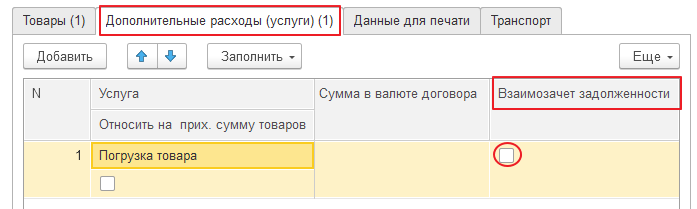 Флаг «Взаимозачет задолженности» в табличной части «Дополнительные расходы»