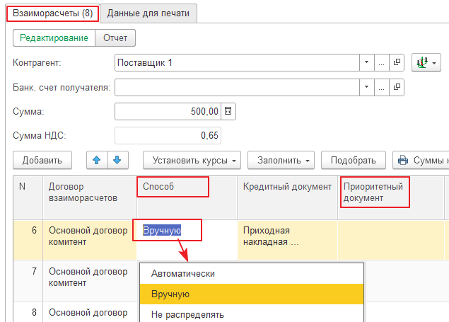 Если выбрано значение «Автоматически», выполняется распределение взаиморасчетов по FIFO по датам кредитного документа. Нераспределенная сумма будет зачислена на проводимый документ. В поле колонки «Кредитный документ» выводится серый текст «<Распределяется автоматически>» и поле для редактирования недоступно. В колонке «Приоритетный документ» может быть указан приоритетный документ для выполнения взаиморасчетов. Если сумма в строке больше долга по приоритетному документу, то происходит погашение долга по остальным документам контрагента автоматически.