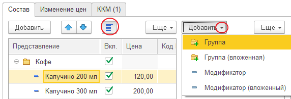 Табличная часть «Модификаторы» позволяет указать модификаторы и создать группы модификаторов для позиции меню или группы позиций. Для этого используется меню кнопки «Добавить»: