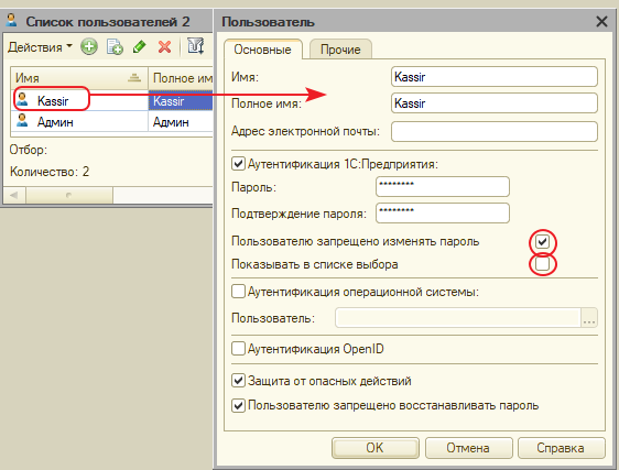 Для задания имени и пароля пользователя, которому доступен режим работы на кассе с Web-сервисами, используется стандартная процедура ввода нового пользователя в конфигураторе 1С. Ограничением при работе с WEB-сервисом являются требования, которые предъявляет используемое ПО для создания сервиса. Например, программа «Apache» запрещает использование символов кириллицы в имени пользователя.
