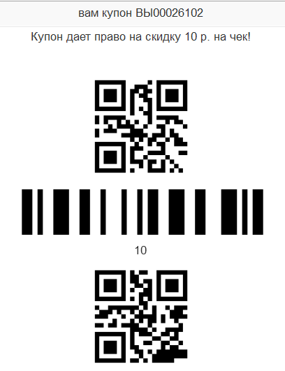 - в реквизит «НоминалКупона» будет передан номинал купона из реквизита «Фиксированный номинал» — выводится номинал купона в виде текста, либо в виде QR кода (следует написать «{QR} НоминалКупона {QR}»), либо в виде штрихкода (следует написать «{Code128} НоминалКупона {Code128}»);