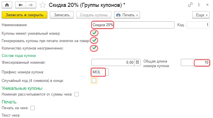 Реквизиты «Префикс номера купона» и «Общая длина номера купона», задаются как для купона с уникальным номером. Флаг «Случайный код (4 символа) в конце» для купонов, привязанных к товару, задавать не обязательно.