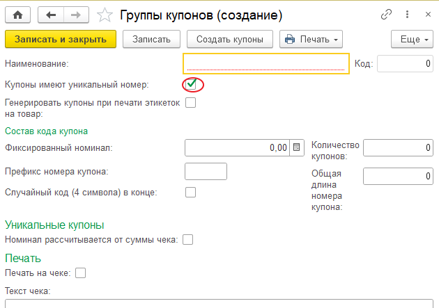 Перечень реквизитов справочнике определяется флагом «Купон имеет уникальный номер».