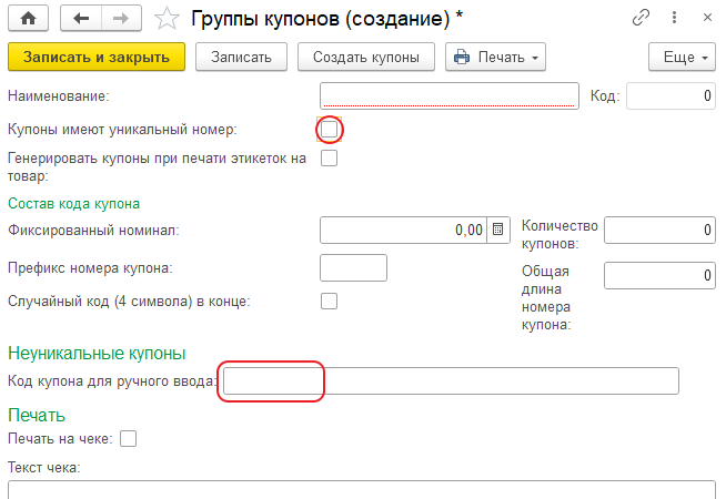 Реквизит «Количество купонов» определяет количество выпущенных купонов по этой группе.