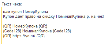 - в реквизит «НомерКупона» будет передан номер купона — выводится полный номер купона в виде текста, либо в виде QR кода (следует написать «{QR} НомерКупона {QR}»), либо в виде штрихкода (следует написать «{Code128} НомерКупона {Code128}»);