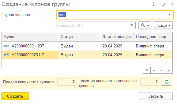 Для создания купонов по заданным реквизитам следует сохранить элемент справочника в базе данных (кнопка «Записать») и кнопкой «Создать купоны» открыть форму «Создание купонов группы».