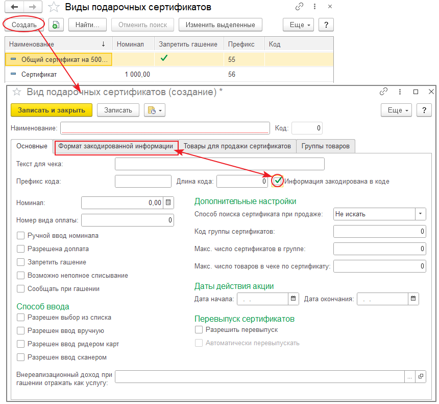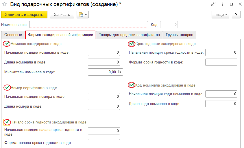 - Информация закодирована в коде — с помощью данного реквизита кассовое ПО определяет способ передачи информации о сертификате. Если флаг у реквизита установлен, то информация о сертификате кодируется в коде сертификата. При этом становится доступной закладка «Формат закодированной информации», определяющая данные для кодирования;