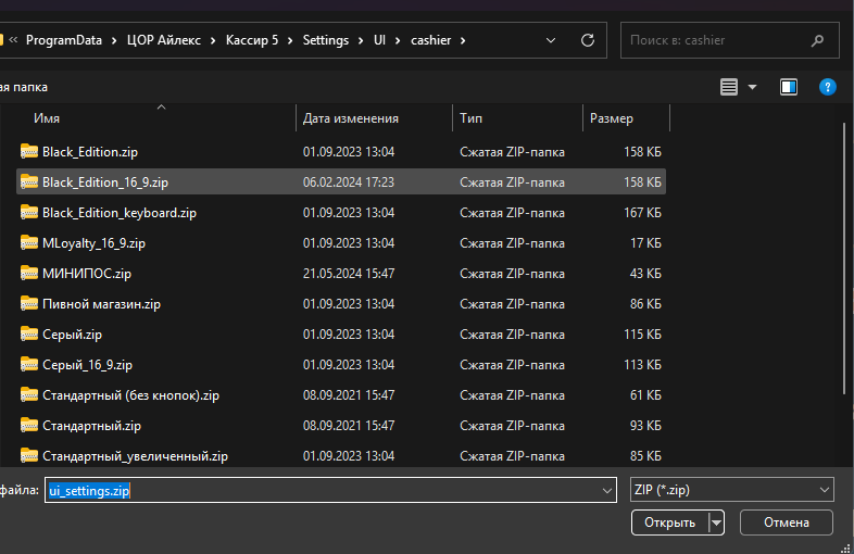 Загрузить предустановленные настройки АИ можно нажатием на кнопку «Загрузить настройки» и выбрать в каталоге «каталог установки Кассир 5»\Settings\UI zip архив. Также можно выбрать предустановленные настройки АИ и просмотреть скриншоты в «мастере настроек» в разделе «Настройка интерфейса».