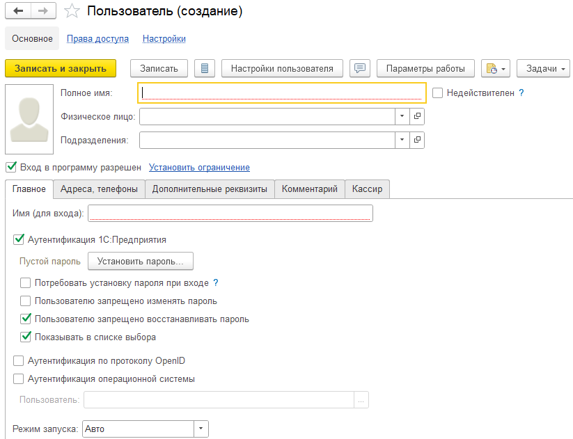 "Полное имя пользователя" — в реквизите указывается имя, под которым пользователь будет виден в справочнике «Пользователи».