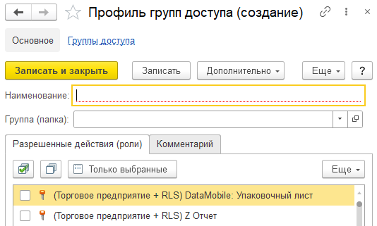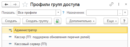В справочнике выводятся предопределенные элементы — профили групп доступа, созданные автоматически. Для создания профиля «Кассовый сервер» следует нажать кнопку «Создать».