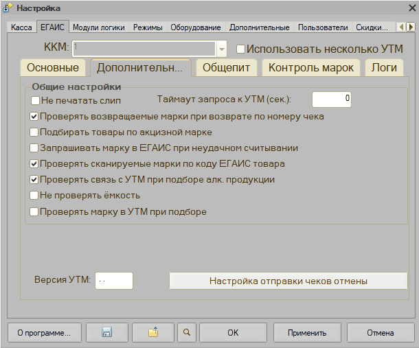 Проверять связь с УТМ при подборе алк. продукции - Для того, чтобы исключить проблемы с УТМ в момент закрытия чека и сразу отказать в продаже, если УТМ не отвечает, нужно установить данный флаг