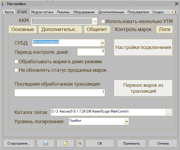 Последняя обработанная транзакция - Указывается транзакция до которой все продажи обработаны и учтены в СУБД. Если делается новая настройка в уже рабочей программе, то нужно нажать на кнопку Перенос марок из транзакций, чтобы выполнить заполнение новой СУБД