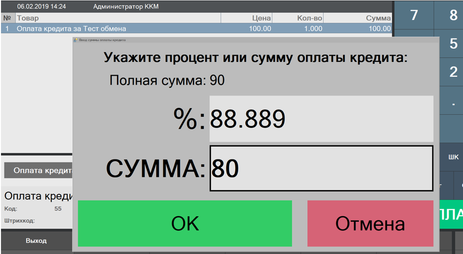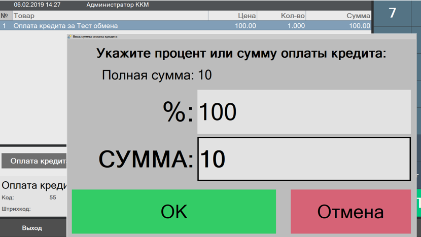 Б) В сервисе выбираем Оплата кредита и вводите номер чека, по которому надо внести оплату по кредиту. (Если не указывать номер и нажать Отмена в окне запроса номера чека программа предложит оформить чек оплаты без чека основания, т.е. товар надо будет выбрать вручную)