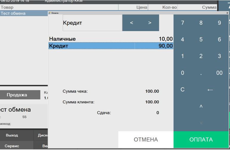 2. В выборе типа оплаты добавляем Кредит, вносим сумму, которую оплачиваем сейчас и сумму кредита (если товар отпускается в кредит полностью, то вносим в оплату Кредит всё стоимость).
