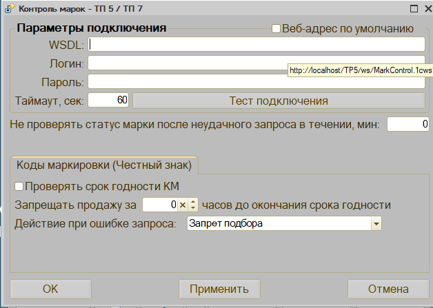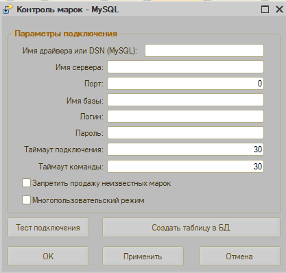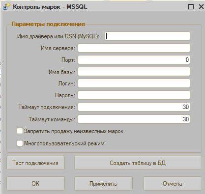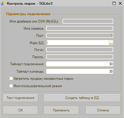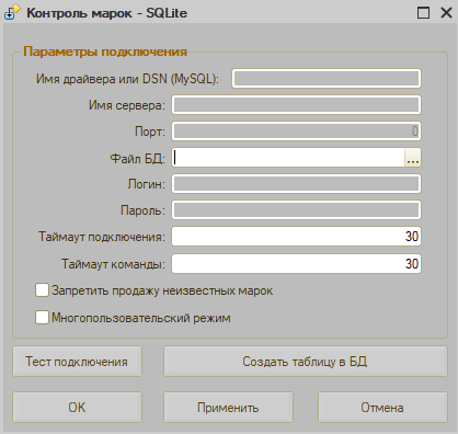 В настройках указываются параметры подключения к БД и есть возможность создать базу. Торговое предприятие 7 не пишет в эту базу коды маркировки, которые были получены.