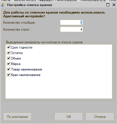 В данном разделе настраивается как будут выводиться краны при работе с ними в регистрации продажи