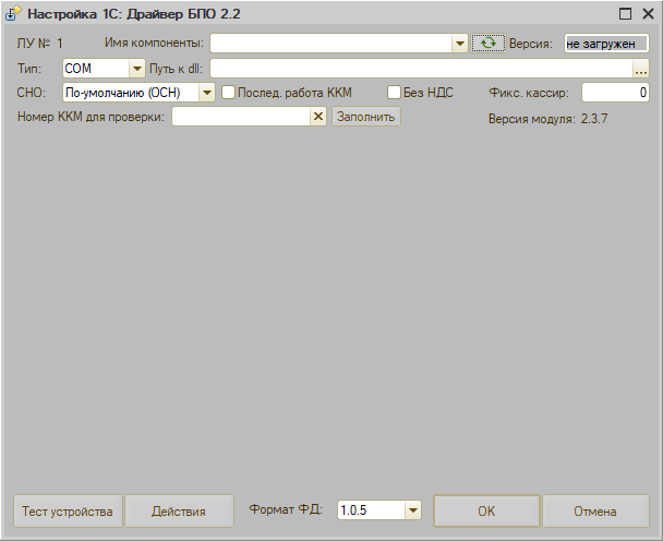 Форма настройки "Драйвер 1С: БПО 2.2"