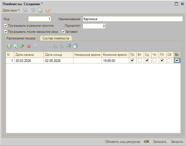 Определяются даты, время и дни недели в которые будут показываться ролики.