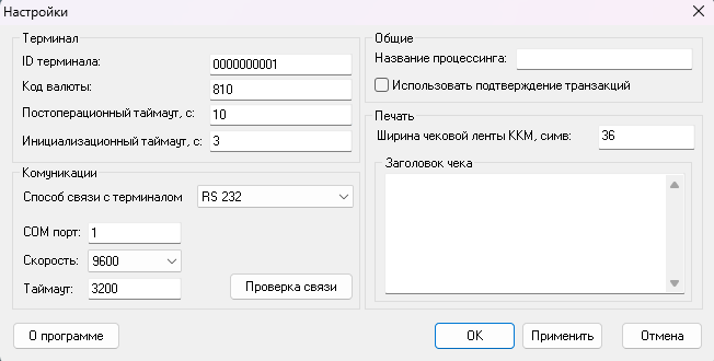 Нажатие на данную кнопку приводит к отправке запроса инициализации терминалу, используя параметры терминала и параметры комуникации, указанные в соответствующих полях. Если получить ответ не удалось будет выдано сообщение об ошибке. Если ID терминала в ответе не совпал с установленным в настройках, производится корректировка параметра настроек.