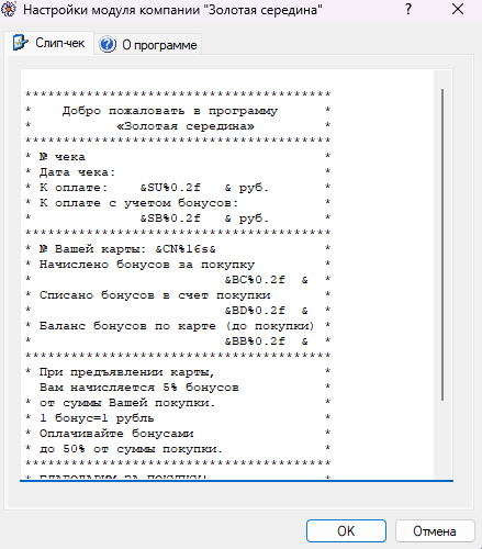 Шаблон слип-чека, выдаваемого модулем можно настраивать. Для этого существует закладка «Слип-чек» в окне настроек модуля. Шаблон представляет собой произвольный текст со специальными полями, которые будут вычислены и подставлены в чек. Каждое подставляемое поле ограничено символом '&' в начале и в конце. Затем идет двухбуквенное регистрочувствительное наименование поля, а затем спецификатор формата. Спецификатор формата должен быть такой же, как для C-функции printf. Например, *&SU%8.2f &* означает поле SU (сумма чека), отформатированное как число с десятичной точкой, с точностью 2 знака после запятой и шириной 8 символов. Выравнивание полей осуществляется по правой границе. Если ширина получившегося отформатированного значения получилась меньше, чем ширина строки между начальным и конечным символами '&', производится дополнение пробелами слева (выравнивание по правой границе).