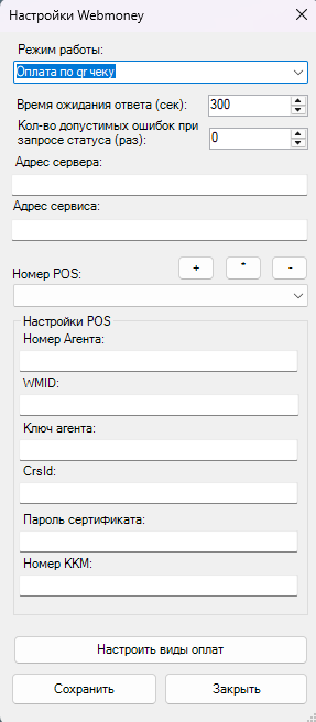 В настройке типов безналичных оплат выбрать модуль интеграции WebMoney, нажать настройки и там указать: