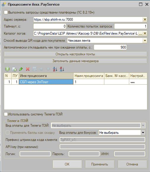 7. По кнопке "Заполнить данные менеджера" производится запрос на сервер и заполняются настройки. Если настроек нет (выбора процессингов), то сервер не доступен и требуется проверить, что порт закрыт