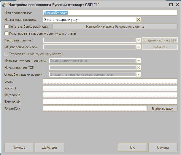 Задаются параметры работы процессинга. Данные для заполнения получаются от банка