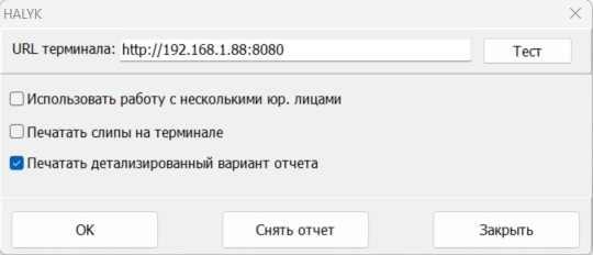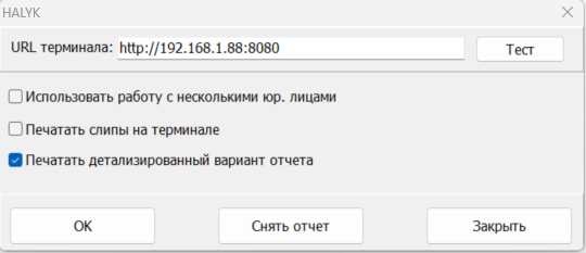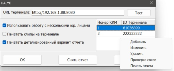 При настройке настраиваются опции - url терминала, печать слипов на терминале или ккм, Тип распечатываемого отчета - краткий или детальный. Тут же можно проверить связь с терминалом или снять отчет.