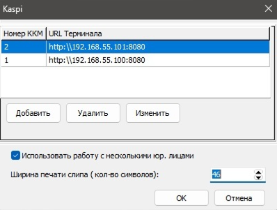 При включении режима работы с несколькоми юрлицами вместо поля с URL терминала появляется теблица , в которую с помошью кнопок можно добавлять, удалять или изменять настройки терминала для каждого юрлица.