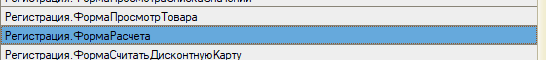 Например, если требуется задать настройки для формы окна выбора видов оплат, то находим Регистрация.ФормаРасчета