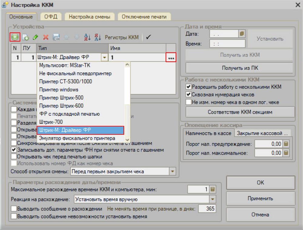 В открывшемся окне нажимаем кнопку "Добавить", выбираем тип "Штрих-м: Драйвер ФР", указываем произвольное Имя и открываем настройки, нажав на 3 точки.
