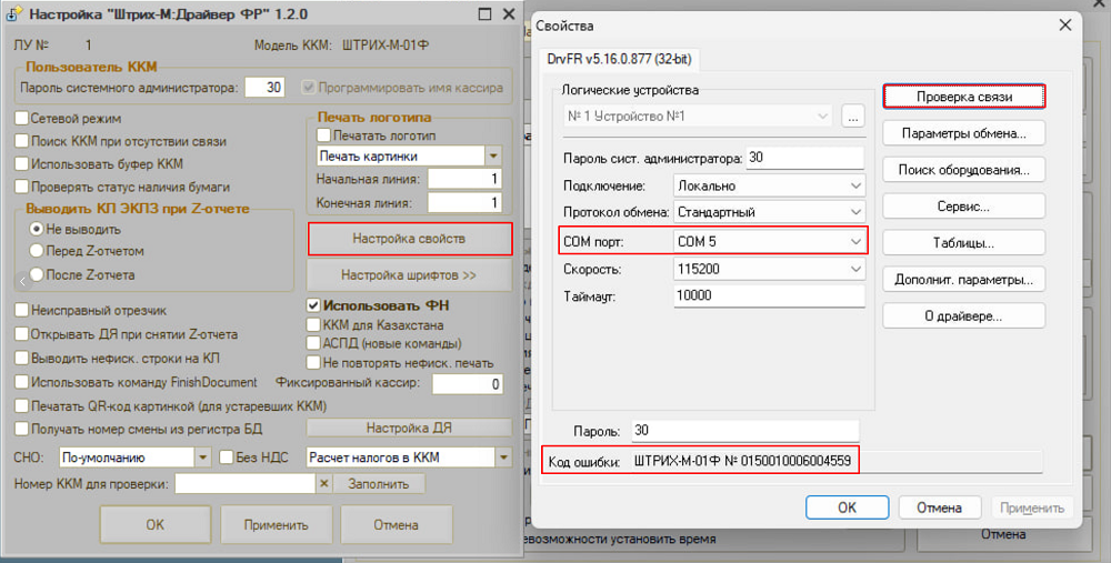 В настройках нажимаем кнопку "Настройка свойств", в свойствах указываем COM-порт куда подключен физически наш ФР и нажимаем "Проверка связи", успешным результатом будет выведено название и номер устройства в поле "Код ошибки"
