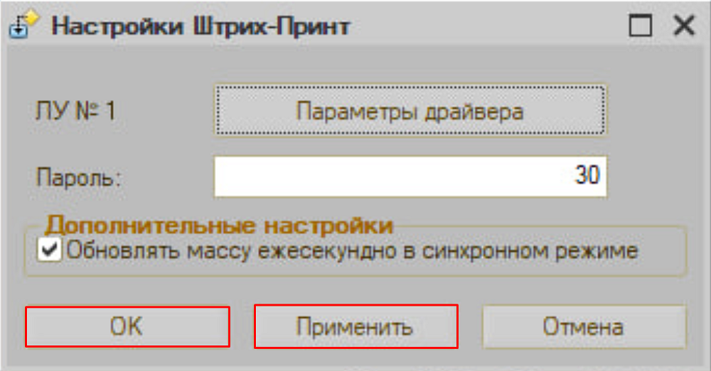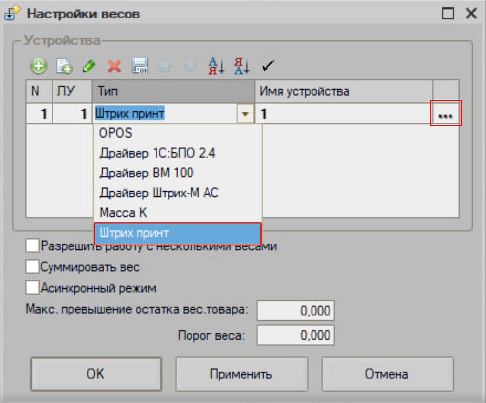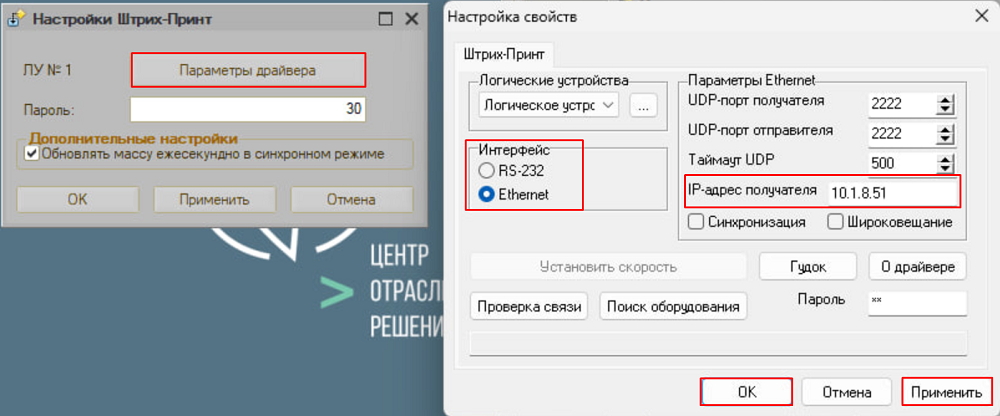 Нажимаем кнопку "Параметры драйвера", в свойствах указываем интерфейс подключенных весов, указываем адрес устройства, после нажимаем "Применить" и "ОК"
