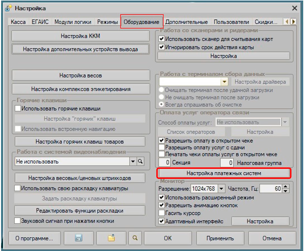 Для подключения процессинга INPAS в Кассир 5 открываем настройки, переходим на вкладку "Оборудование", нажимаем на кнопку "Настройка платежных систем"